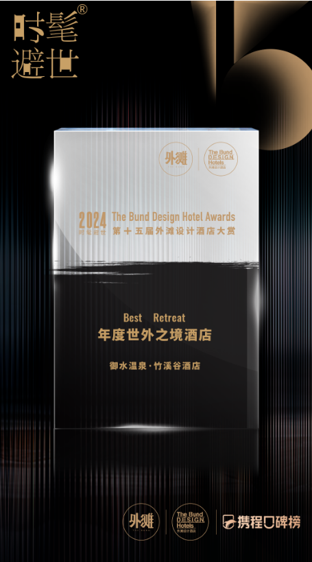 2024年1月10日,第十五届外滩设计酒店大赏颁奖典礼在上海举办。作为引领全球设计酒店行业发展风潮的标杆性大奖,外滩设计酒店大赏以一贯坚持的国际化视野和设计师维度,更以对于行业的敬畏之心,精准解读时髦避世,引领行业风向。会上颁发了第十五届外滩设计酒店年度奖项,其中,天目湖旅游旗下御水温泉·竹溪谷酒店荣获“年度世外之境酒店”奖项。
