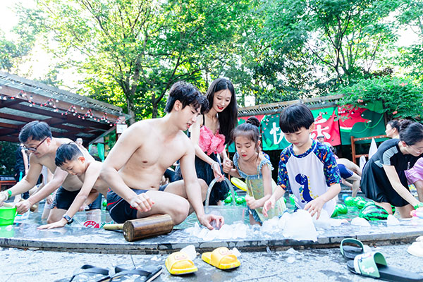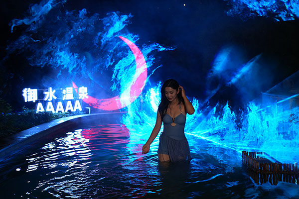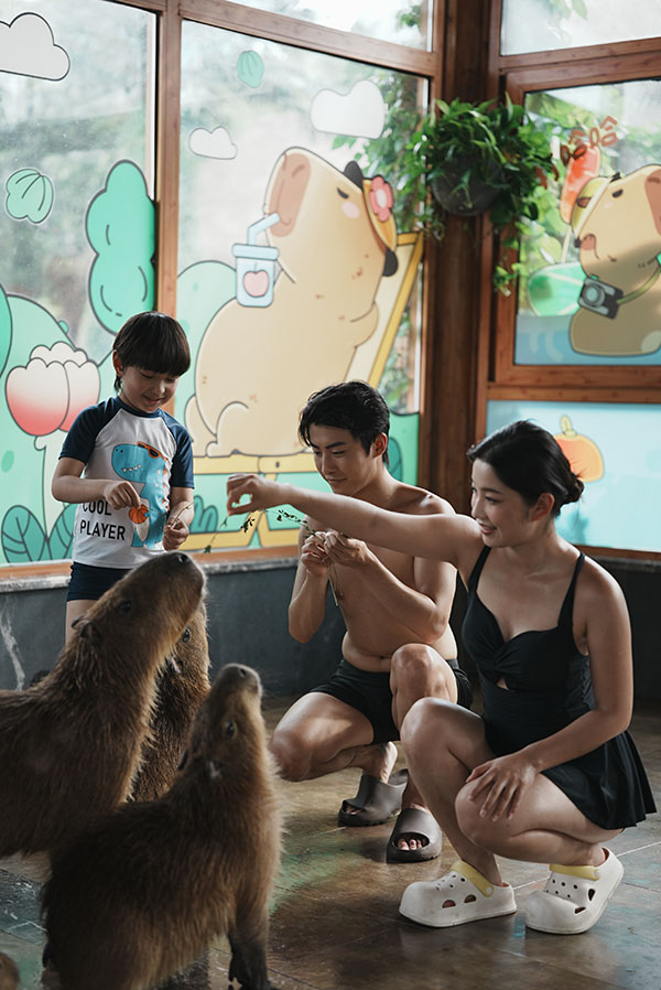 在御水温泉,游客不仅可以体验到夏日特色“极光温泉”、在柠檬主题泡池和熊猫主题泡池中消暑,还可以体验一场“瓜式聚会”,与“穿越”到温泉的“汉服卖瓜郎”互动,体验感十足。网红打卡项目新中式冰饮市集、围炉冰茶现场氛围感满满,受到年轻人热捧。