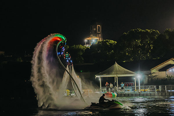 天目湖山水园以“去·嬉水”为主题,打造更多亲水和观景的暑期体验活动。豚豚大巡游,让游客从进园开始就可以与水豚趣味互动;突破传统夜航模式的水上行进式观景全系焕新,《诗画天目湖》五大篇章人文历史主题情景抒情,整体演艺以水为基,以游览天目湖与历史多位名人时空交遇为述,集山水诗意之美、古典文化之美、光影科技之美于一体,给游客带来震撼心灵的视听体验。海陆空玩水-水上飞人演艺项目凭借一飞冲天、蛟龙入海等挑战性动作引起游客尖叫连连。逛江南茶村夜市,领略文化奇趣夜,游客们在这里听皮影戏、看火流星表演置身于一个充满奇幻与浪漫的湖畔之夜。沙滩音乐Iive、浑水摸鱼、快乐厨房、萤火流莹等丰富多彩的活动,展示了天目湖嬉水的独特魅力。此外,天目湖暑期夜公园还汇聚了众多地道的美食。游客们可以在园区内的虾湖闹美食集市品尝到啤酒、龙虾各种美食佳肴,感受舌尖上的美味之旅。天目湖水世界白加黑玩法,丰富水娱体验,水上大闯关嗨爆全场,多巴胺夏日,每周不同精彩。
