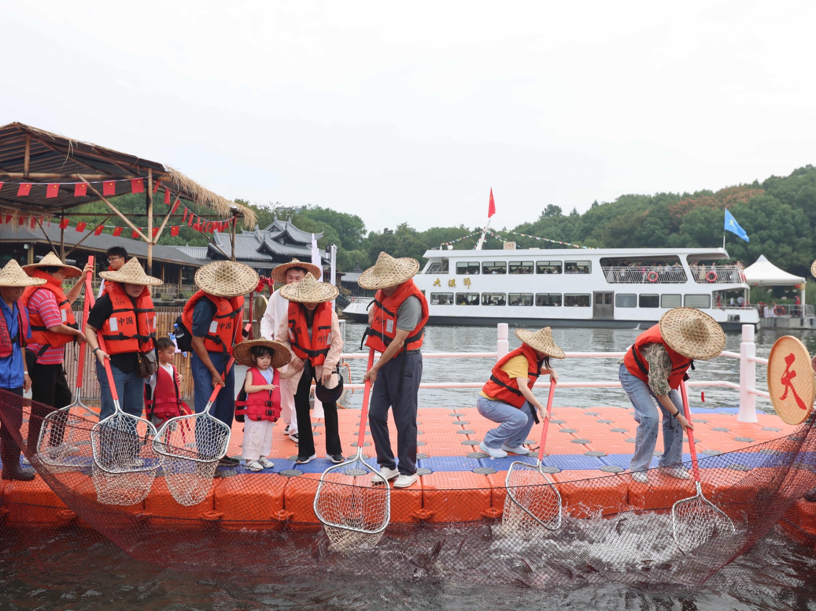 山水园化身渔乡文化体验场,日间以“江南秋捕”再现渔乡盛景,游客可跨龙门、共捕鱼、竞逐鱼王;巨型砂锅烹制的特色鱼头汤与黄金晒秋景观,成为秋日限定的味觉与视觉盛宴。夜间则以乘船夜游、提灯赏月点亮夜色浪漫。此外,景区还配套开展了手作、非遗戏法与萌宠互动等活动,丰富游客游玩体验。